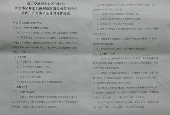 12月31日上午,学院与南京伟亿精密机械制造有限公司建立“校内生产型实训基地”的合作协议签署仪式在明志楼306会议室举行。副院长高进军代表学院在协议书上签字。