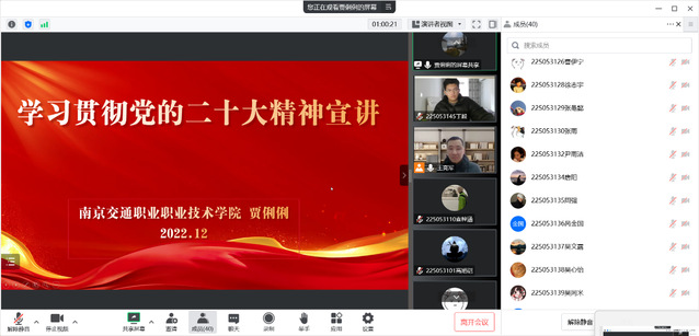 为深入学习贯彻党的二十大精神,引导广大学生坚定不移听党话、跟党走,12月21日下午,贾俐俐书记参加了城轨车辆2202班“学习二十大,奋进新征程”线上主题班会。