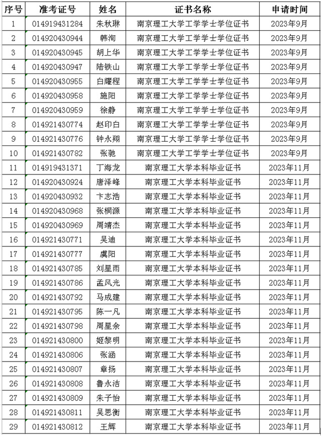 2023年9月申请的南京理工大学工学学士学位证书和2023年11月申请的南京理工大学本科毕业证书已顺利下发,请联系孙艳霞老师领取。