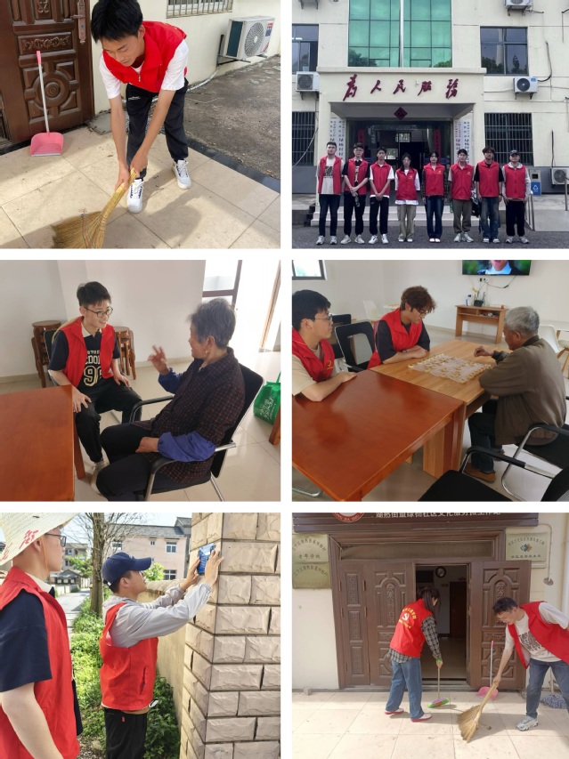 志愿者们身穿红马甲,认真张贴“门前三包”责任牌,清理社区落叶和垃圾,为村民营造干净、整洁的生活环境。绿杨村社区是偏老龄化的社区,同学们在支部党群活动中心,通过与老人接触互动,认真倾听老人们的故事和心声,了解他们的健康状况和需求,给予他们精神上的慰藉。