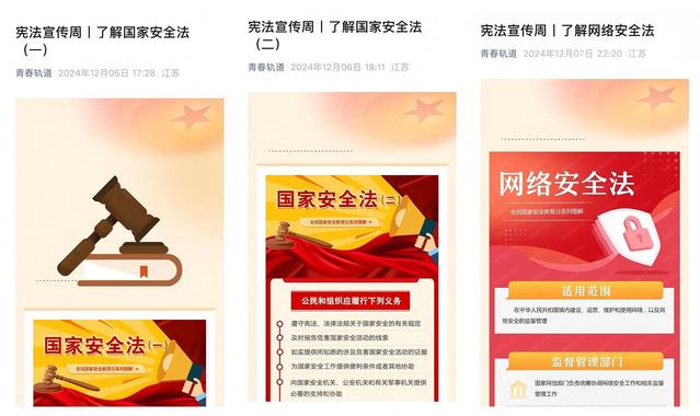 1.多元宣传,弘扬宪法精神。通过电子屏展示了“宪法宣传周”活动宣传标语和宣传图片,并利用微信公众平台广泛宣传宪法及国家安全法、网络安全法、国旗法等宪法相关法律知识,有效提升了师生的宪法意识。