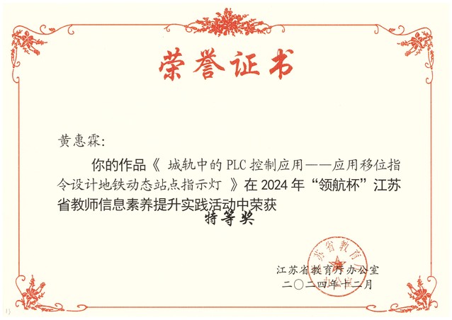 近日,由江苏省教育厅主办的2024年“领航杯”江苏省信息化应用能力大赛结果公布,我院黄惠霖老师的微课作品《城轨中的PLC控制应用——应用移位指令设计地铁动态站点指示灯》获得2024年“领航杯”江苏省教师信息素养提升实践活动特等奖。