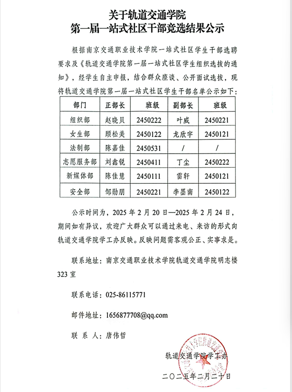 关于轨道交通学院第一届一站式社区干部竞选结果公示