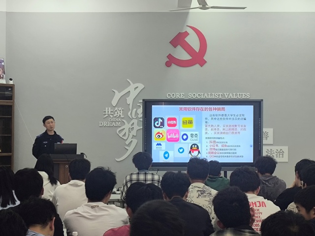 为增强学生反诈意识,筑牢校园安全防线,2025年4月23日,轨道交通学院在F栋一站式学生社区“南山格苑”工作站举办“警校联动筑防线反诈宣传入心田”反诈专题讲座。驻校民警张警官以“识诈防诈共筑平安校园”为题,为百余名同学带来一堂生动的反诈安全教育课。