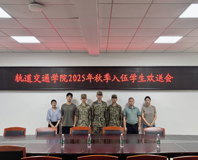2025年9月15日上午,轨道交通学院召开2025年秋季新兵入伍欢送会。学院党总支副书记韩京海、学工办主任王雪琴、征兵工作负责老师侍元元参加会议。