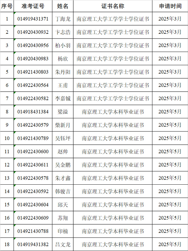 2025年3月申请的南京理工大学工学学士学位证书和2025年5月申请的南京理工大学本科毕业证书已顺利下发,请联系米成龙老师领取。
