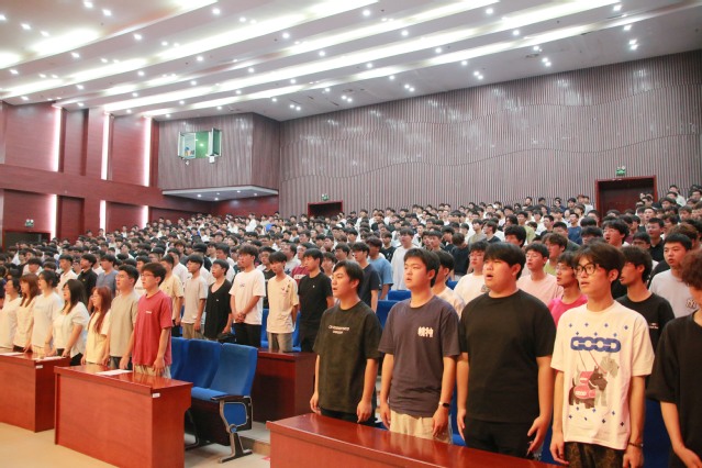 2550221班王国梁同学引领全体新生高举起右拳,庄严宣誓:“热爱专业,矢志报国,交通强国,奉献青春……”这铿锵有力的誓言在报告厅内回荡,充分展现了轨道交通学子们昂扬向上的精神风貌。